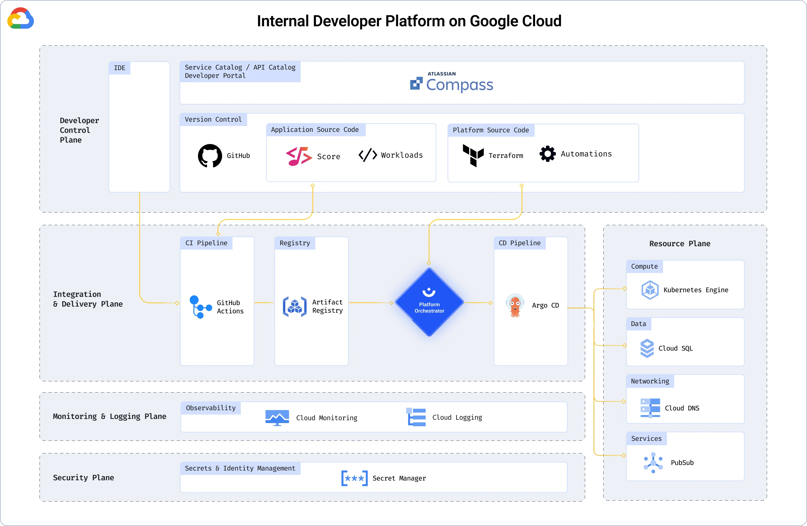 This architecture focuses on the GCP ecosystem and includes GCP GKE, CloudSQL, Compass, Humanitec, CloudBuild, Terraform, and more. Please note that this architecture is compatible with any other tooling choice. Keep in mind, you can easily swap components, e.g. Gitlab for Codepipeline as a CI-tool and the architecture would still be valid.