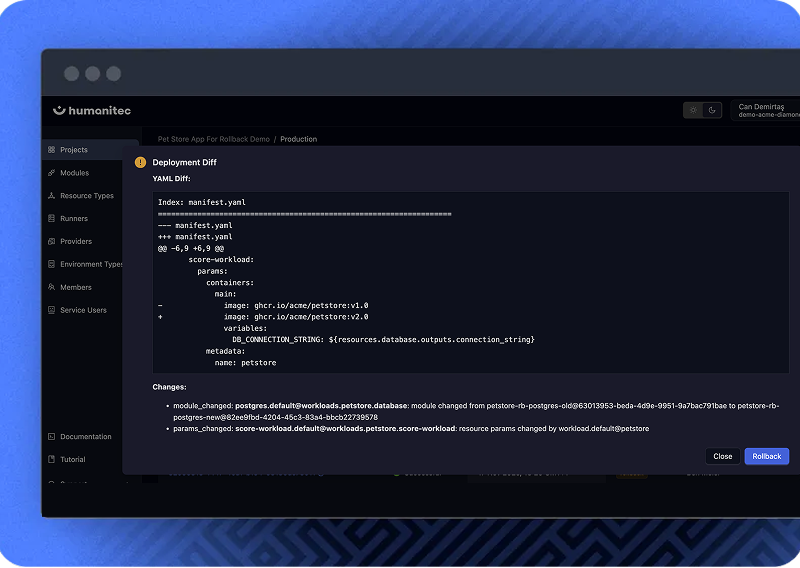 The Platform Orchestrator provides the backend logic for your IDP: deployment workflows, environment rules, resource provisioning, rollbacks, and audit trails. Use it as the source of truth behind any developer platform to offer consistent, governed self-service across all environments.